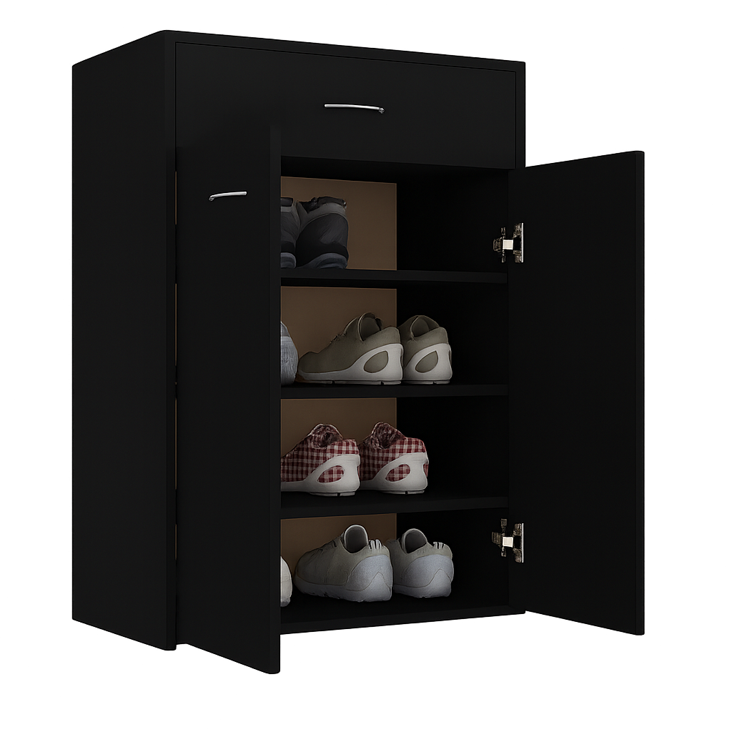 Moderní botník v barvě noir je praktickým a elegantním řešením pro vaši předsíň. Vyrobený z kvalitního kompozitního dřeva, nabízí 4 prostorné police a praktický šuplík navíc, takže poskytne dostatek místa nejen pro boty, ale i pro drobné doplňky, klíče či čisticí prostředky.