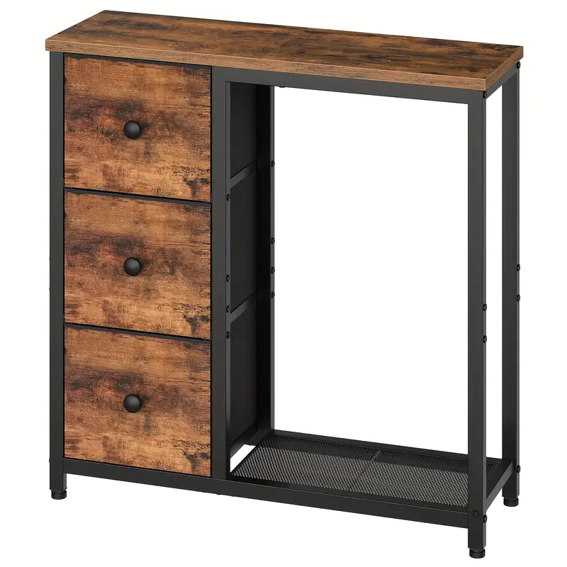 Tento praktický konzolový stůl v retro hnědo-černém provedení kombinuje průmyslový design s vysokou funkčností. Tři prostorné látkové zásuvky a dvě otevřené police poskytují dostatek místa pro uložení dekorací, klíčů, pošty či dalších drobností. Ideální do chodby, předsíně, obývacího pokoje i ložnice.