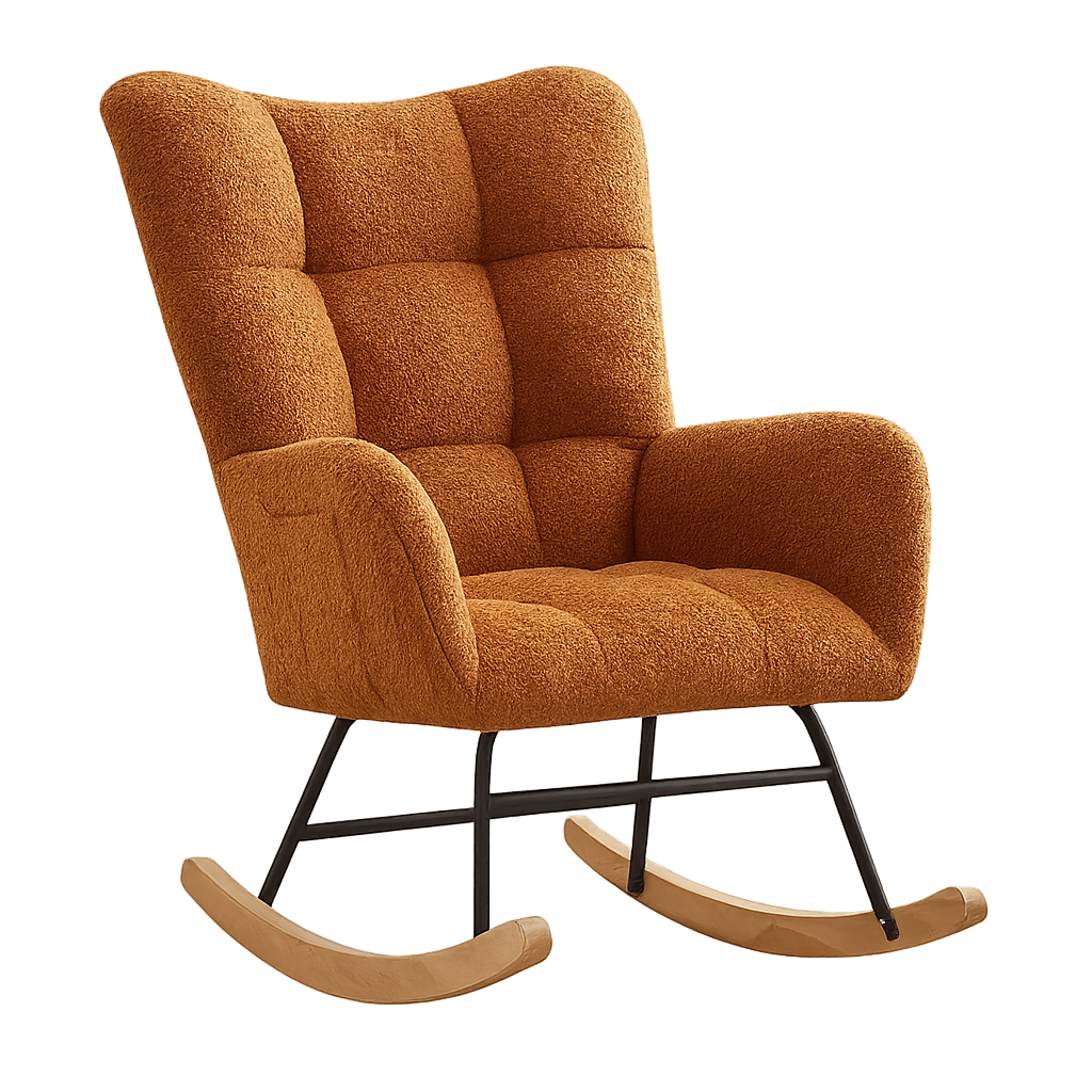 Stylové houpací křeslo v hnědé látce typu bouclé je dokonalým spojením pohodlí a moderního designu. Jemný sametový potah v elegantní barvě doplňuje plyšový polštář, který poskytuje extra komfort při odpočinku. Stabilní rám z kvalitního měkkého dřeva zajišťuje pevnost a dlouhou životnost, přičemž ochranné prvky u nohou brání poškrábání tvrdých podlah.