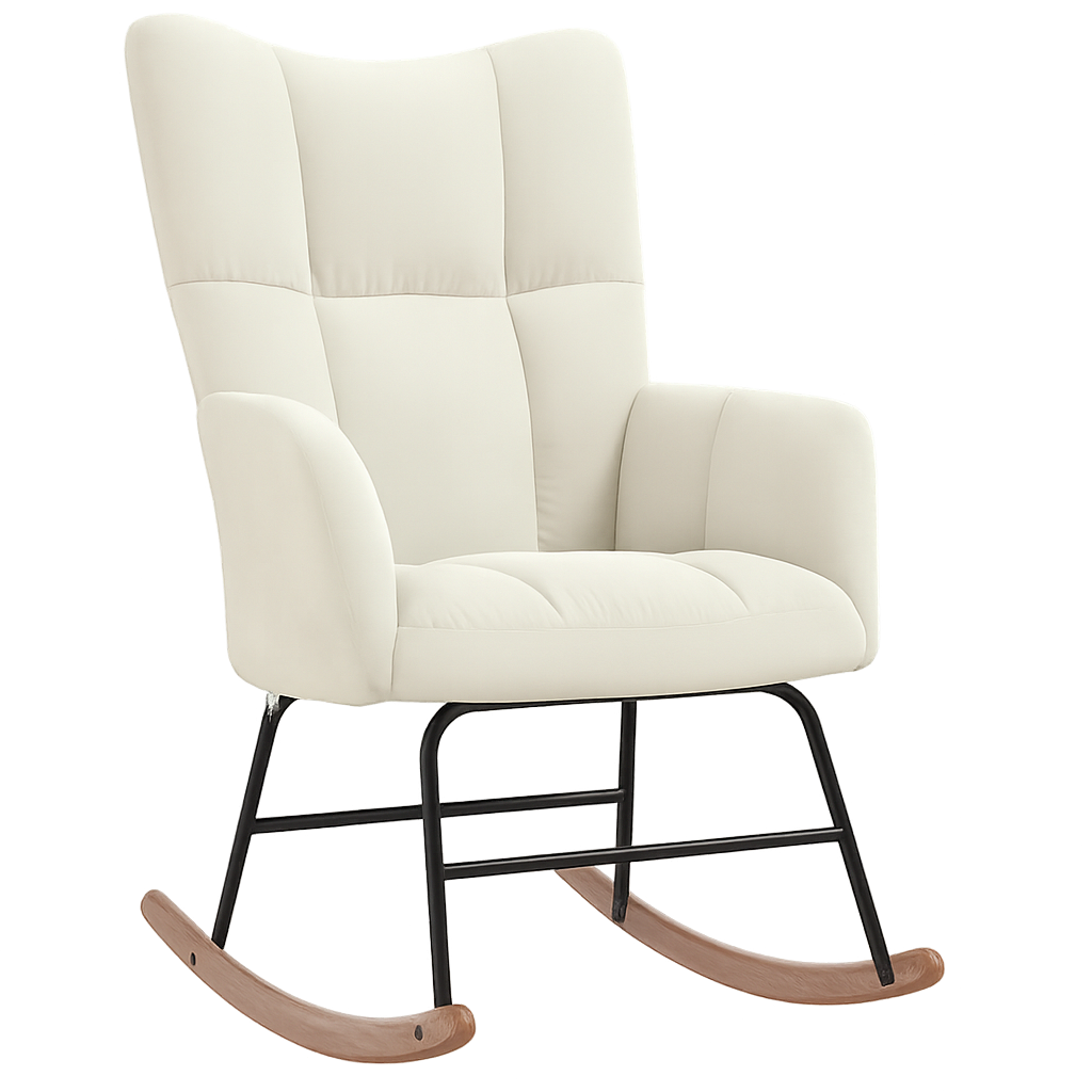 Stylové houpací křeslo ve smetanové látce je dokonalým spojením pohodlí a moderního designu. Jemný sametový potah v elegantní barvě doplňuje plyšový polštář, který poskytuje extra komfort při odpočinku. Stabilní rám z kvalitního měkkého dřeva zajišťuje pevnost a dlouhou životnost, přičemž ochranné prvky u nohou brání poškrábání tvrdých podlah.