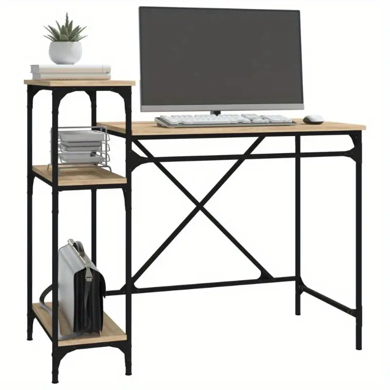 Tento elegantní psací stůl v dekoru dub sonoma kombinuje pevnou dřevěnou konstrukci s praktickými policemi, které poskytují přehledný úložný prostor pro knihy, dokumenty či herní příslušenství. S rozměry 104,14 × 50,8 × 93,98 cm nabízí dostatek místa pro počítač s monitorem, klávesnicí a myší, a je tak ideálním řešením pro domácí kancelář, studium nebo herní zónu.
