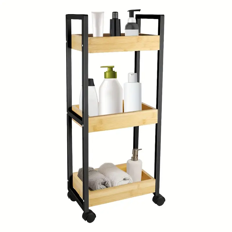 Tři prostorné police umožňují přehledné uložení kosmetiky, ručníků, čisticích prostředků či potravin. Pojízdná kolečka zaručují snadné přemisťování, zatímco stabilní rám z bambusu zajišťuje dlouhou životnost a pevnost. Vozík se jednoduše montuje a svým černým designem se hodí do moderních i přírodně laděných interiérů.