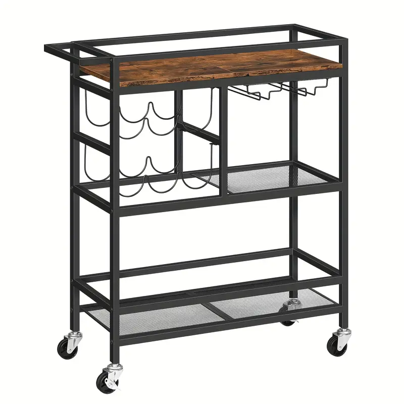 Vozík nabízí tři úrovně úložného prostoru, ideální pro sklenice, lahve, servírovací potřeby nebo dekorace. Díky integrovaným držákům na sklenice a víno budete mít vše přehledně uspořádané a vždy po ruce. Kolečka s plynulým chodem zajišťují snadné přemisťování a boční úchyty usnadňují manipulaci.