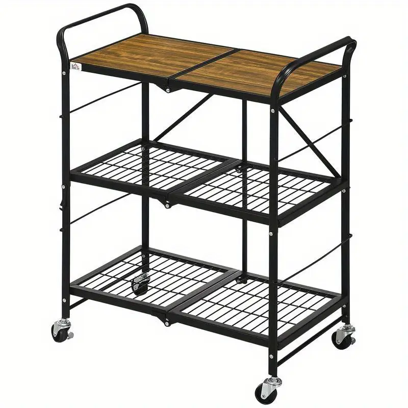 Jeho pevná kovová konstrukce zaručuje stabilitu a dlouhou životnost, zatímco 4 kolečka s hladkým pojezdem umožňují snadné přesouvání i při plném zatížení. Vozík je skládací, takže ho lze jednoduše uložit, když není potřeba – ideální pro malé kuchyně, spíže, kanceláře nebo obývací pokoje.
