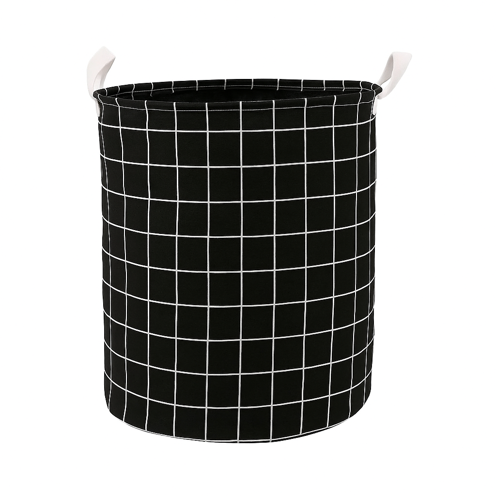 Skládací koš na prádlo kulatý, černý pléd, PLEJO TYP 3