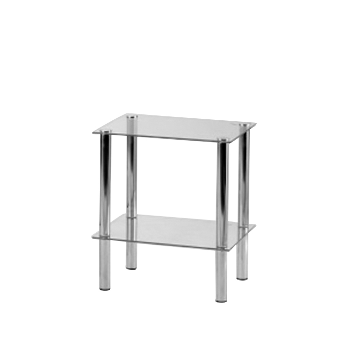 Dvě čiré skleněné police doplněné o lesklou chromovou konstrukci vytvářejí vzdušný a elegantní dojem. Díky kompaktním rozměrům je regál vhodný jak do obývacího pokoje, tak i kanceláře, koupelny nebo haly.