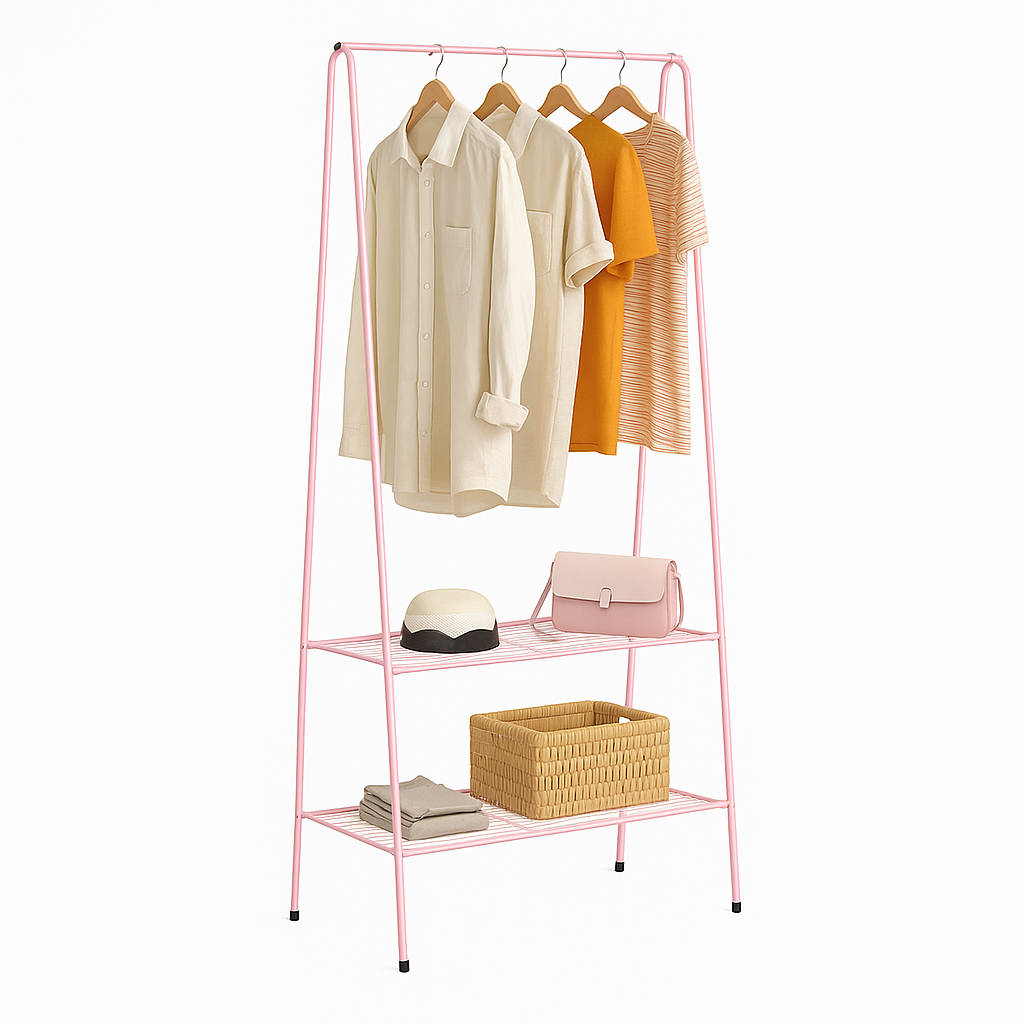 Stojan ROTAR je praktickým a stylovým pomocníkem pro uložení oblečení a doplňků. Jeho pevná kovová konstrukce v růžové barvě působí čistě a moderně, takže se snadno začlení do interiéru ložnice, šatny, studentského pokoje i předsíně.