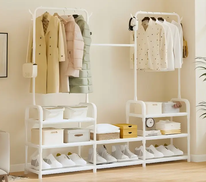 Tento praktický víceúčelový věšák je navržen tak, aby vám pomohl snadno a přehledně zorganizovat oblečení, obuv i doplňky. Díky dvojitým úložným prostorům a čtyřem vrstvám polic nabízí široké možnosti využití – od zavěšení svršků až po uložení tašek, krabic nebo sezónních věcí.