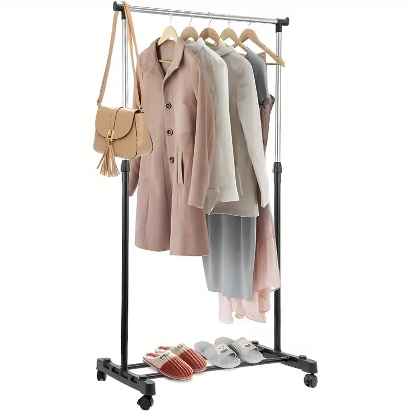 Volně stojící věšák na oblečení s možností nastavení výšky, kombinace kovu a plastu.