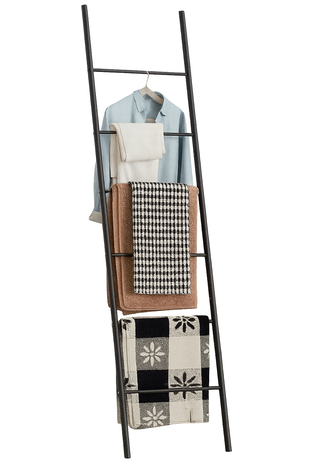 Věšák CYKRUS přináší spojení praktičnosti a moderního stylu. Jeho žebříková konstrukce z kovu s černým nátěrem působí čistě, vzdušně a přirozeně. Díky tomu se hodí jak do moderní ložnice, tak i do předsíně, studentského pokoje nebo hotelového pokoje.