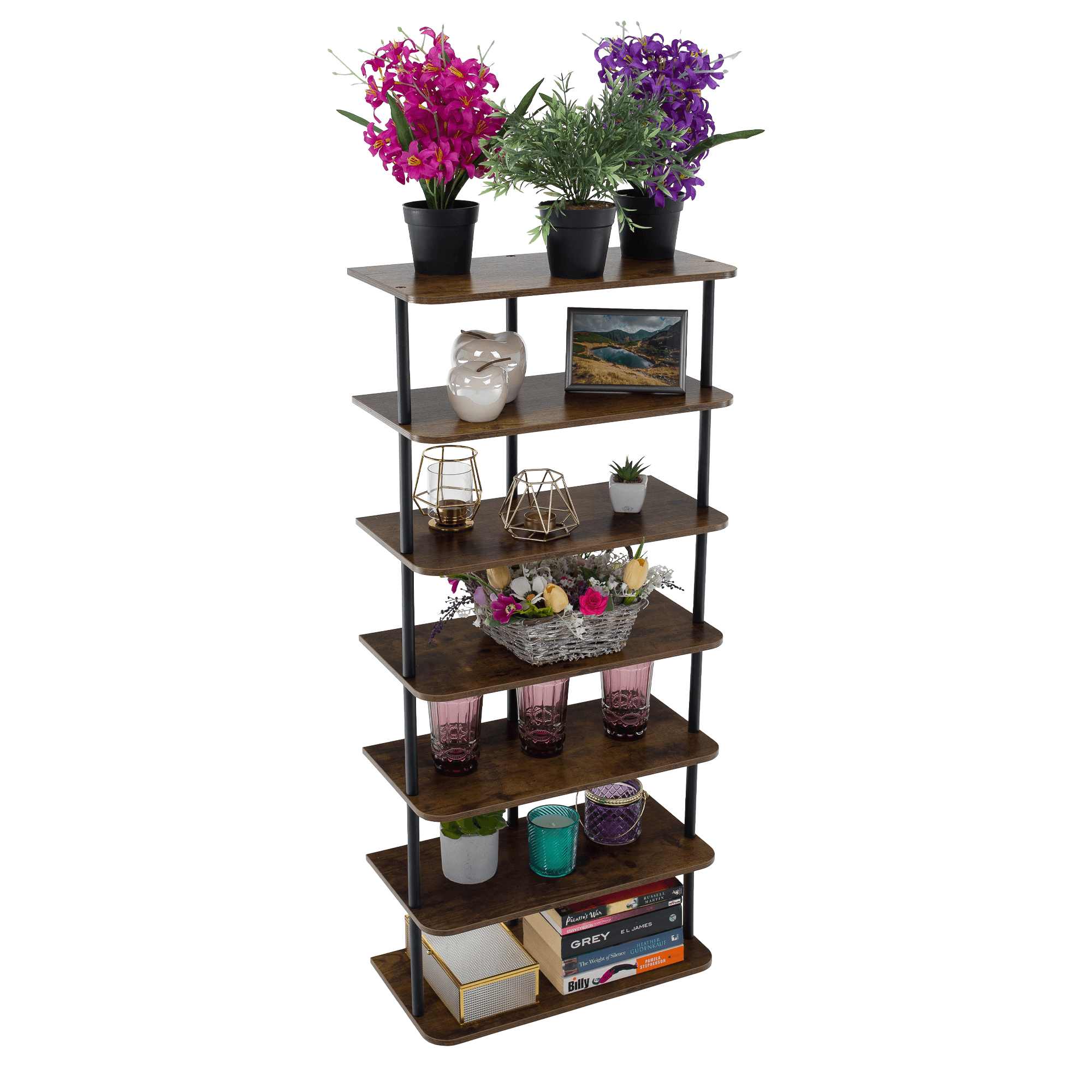 Víceúčelový regál ETUDA TYP 2 spojuje industriální eleganci a funkční provedení. Robustní černá kovová konstrukce a police v dekoru rustikálního dřeva vytvářejí moderní a zároveň teplý vzhled. Díky šesti policím nabízí dostatek úložného prostoru pro knihy, dekorace, obuv či koupelnové doplňky. Díky štíhlému profilu se hodí i do menších místností.