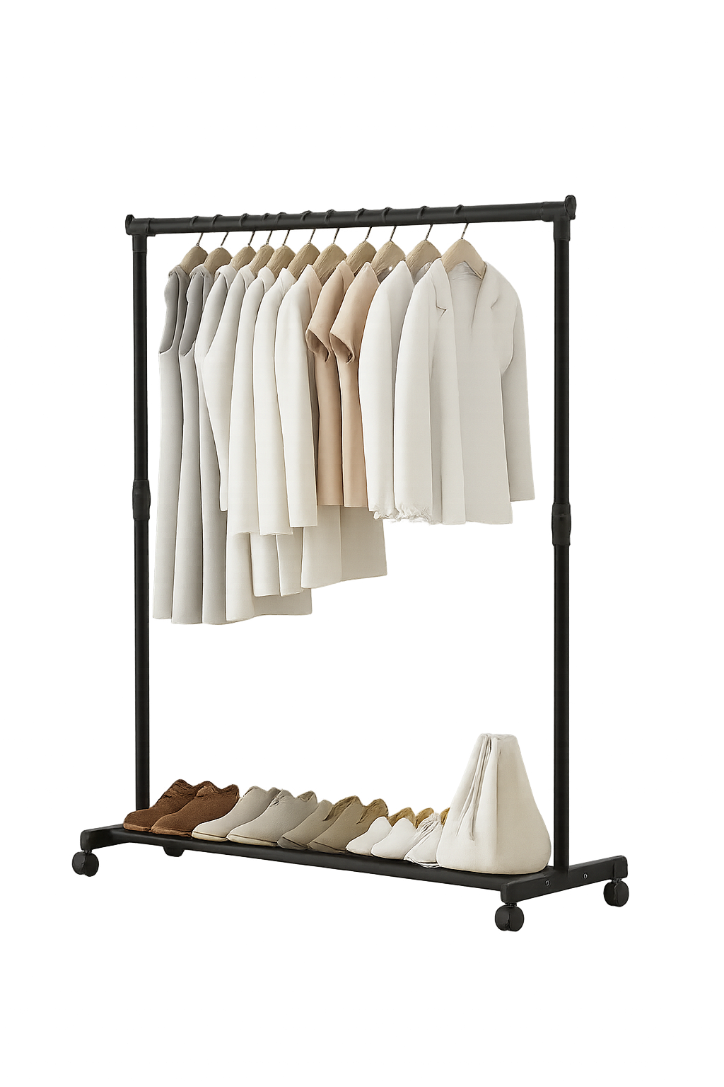 Tento minimalistický stojan na oblečení kombinuje funkčnost, moderní vzhled a variabilní využití. Je vyroben z kvalitní kovové konstrukce s černým matným povrchem a je vhodný jak do interiéru, tak na venkovní použití – např. jako sušák na balkon, přenosný věšák do ložnice, nebo organizér do chodby. Díky nastavitelné výšce až 125 cm se hodí na košile, kabáty, šaty i delší textilie.